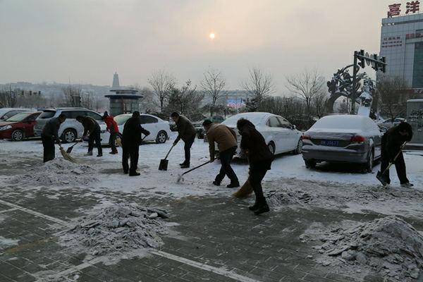 春節(jié)收假后的第一天,集團公司辦公室第一時間通知機關各部室人員,清掃主樓站前廣場積雪,各部室積極響應。大家不畏嚴寒,揮舞著鐵鍬掃帚,清掃廣場及通道的積雪。